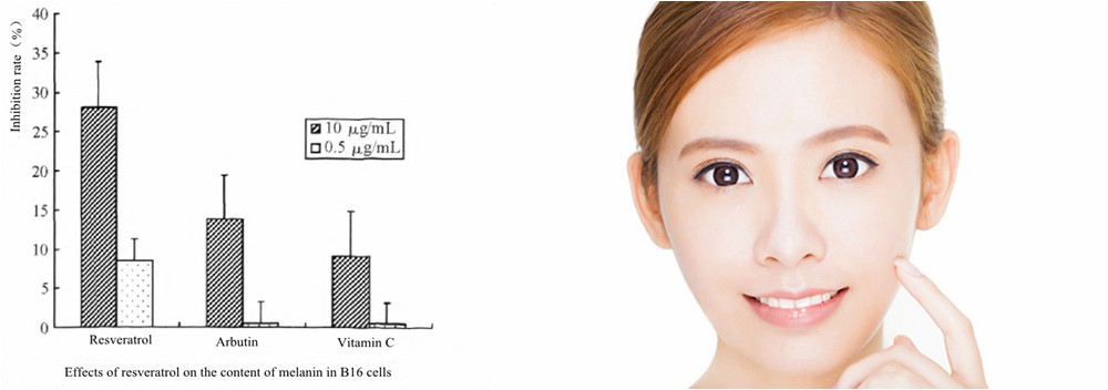 Resveratrol can inhibit cell proliferation. It can significantly inhibit tyrosinase activity, and reduce melanin content. Thus Resveratrol plays a role of whitening skin. In addition, Resveratrol has strong UV absorbency. It has maximum UV absorption at 366nm. It can reduce radiation damage to skin caused by ultraviolet light.